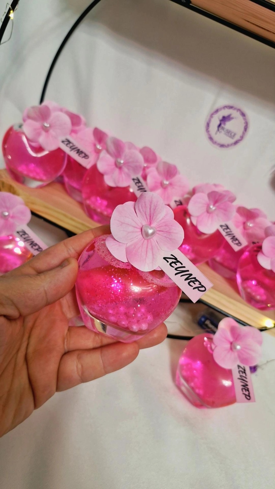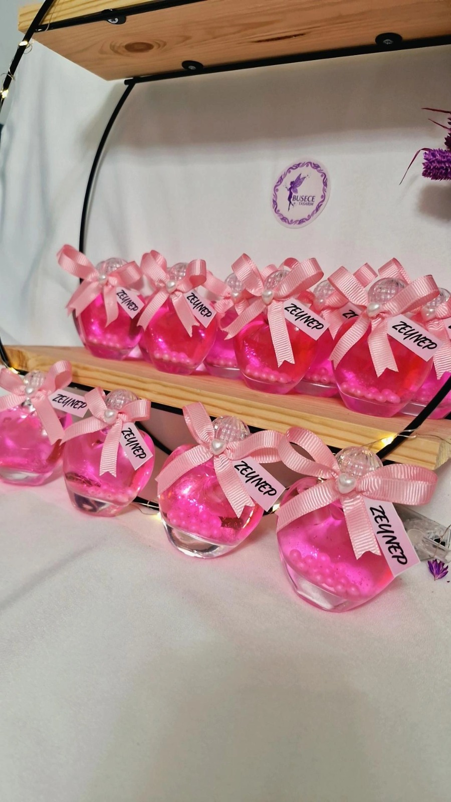 Kalpli cam şişe kolonya, çiçek veya kurdele süsleme tercih edilebilir.